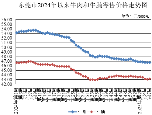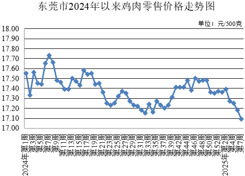 第7周,牛肉農貿市場零售均價為每500克46.68元,與上周持平。牛腩農貿市場零售均價為每500克43.14元,較上周上升0.21%。雞肉農貿市場零售均價為每500克17.09元,較上周下降0.52%。